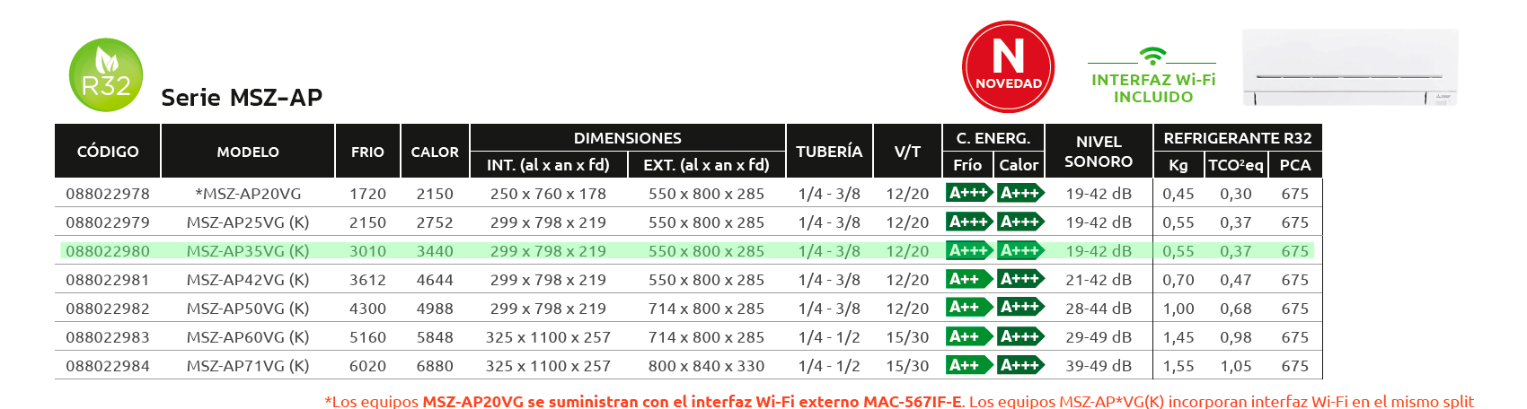 Tabla Aire Acondicionado Mitsubishi MSZ-AP35VG(K)