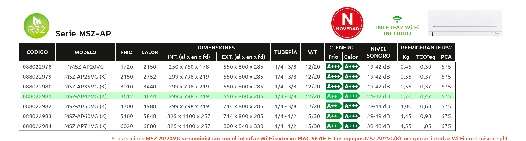 1 unidad exterior + 1 unidad interior + mando a distancia + Wifi
