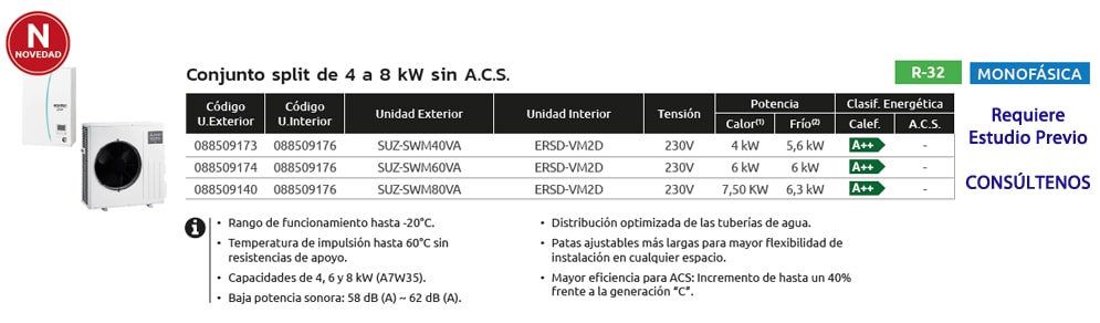 Aerotermia MITSUBISHI ELECTRIC SUZ split 4 a 8 kW sin ACS
