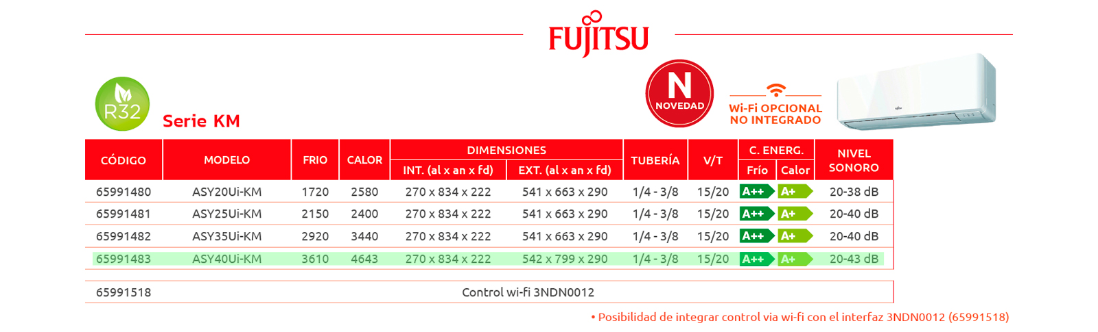 Aire Acondicionado Fujitsu, inverter, A++, R32, con Bomba de Calor. Adaptado a la normativa europea 2020 de máxima eficiencia y uso de refrigentante ecológico R32. Compuesto por una unidad exterior y otra interior. Potencia: 3.610 fg/hora en refrigeración y 4.643 Kcal/hora en calefacción. El Aire Acondicionado FUJITSU ASY40UI-KM es un equipo de potencia muy alta dotado de las últimas tecnologías en climatización por aire, minimizando el consumo eléctrico y optimizando la energía consumida para un óptimo nivel de confort. Un aire acondicionado Fujitsu a un precio fantástico.