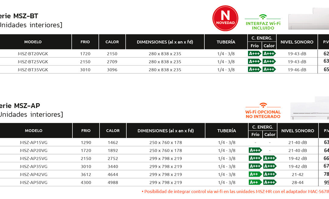 Tabla Aire Acondicionado Mitsubishi MultiSplit MSZ-BT y MSZ-AP interior