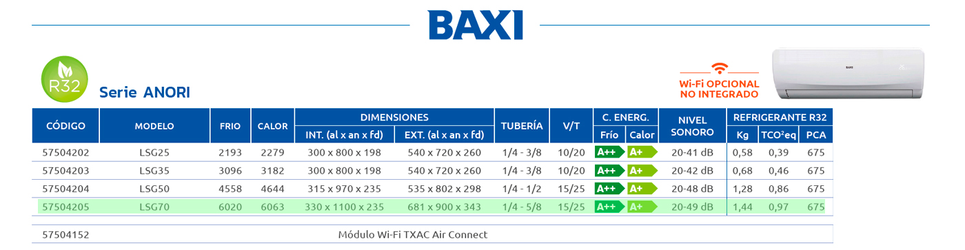 Aire Acondicionado Baxi, inverter, A++, R32, con Bomba de Calor. Adaptado a la normativa europea 2020 de máxima eficiencia y uso de refrigentante ecológico R32. Compuesto por una unidad exterior y otra interior. Potencia: 6.020 fg/hora en refrigeración y 6.063 Kcal/hora en calefacción. El Aire Acondicionado BAXI ANORI LSG70 es un equipo de muy alta potencia dotado de las últimas tecnologías en climatización por aire, minimizando el consumo eléctrico y optimizando la energía consumida para un óptimo nivel de confort. Un aire acondicionado Baxi a un precio fantástico.