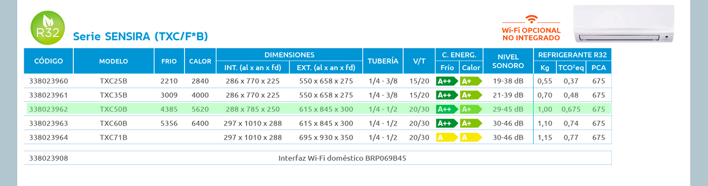 Aire Acondicionado Daikin, inverter, A++, R32, con Bomba de Calor. Adaptado a la normativa europea 2020 de máxima eficiencia y uso de refrigentante ecológico R32. Compuesto por una unidad exterior y otra interior. Potencia: 4.385 fg/hora en refrigeración y 5.620 Kcal/hora en calefacción. El Aire Acondicionado DAIKIN SENSIRA TXC50B es un equipo de potencia alta dotado de las últimas tecnologías en climatización por aire, minimizando el consumo eléctrico y optimizando la energía consumida para un óptimo nivel de confort. Un aire acondicionado Daikin a un precio fantástico.