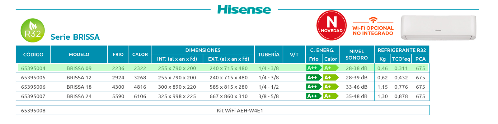 Aire Acondicionado Hisense, inverter, A++, R32, con Bomba de Calor. Adaptado a la normativa europea 2020 de máxima eficiencia y uso de refrigentante ecológico R32. Compuesto por una unidad exterior y otra interior. Potencia: 2.236 fg/hora en refrigeración y 2.322 Kcal/hora en calefacción. El Aire Acondicionado HISENSE BRISSA 09 es un equipo de potencia media dotado de las últimas tecnologías en climatización por aire, minimizando el consumo eléctrico y optimizando la energía consumida para un óptimo nivel de confort. Un aire acondicionado Hisense a un precio fantástico.