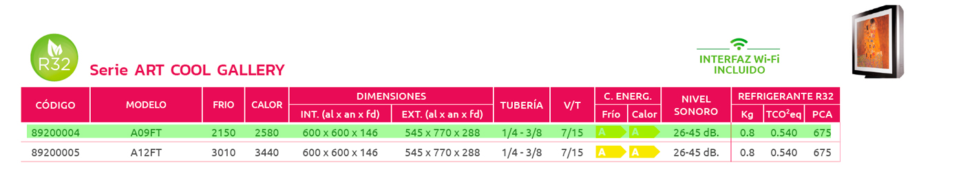 Aire Acondicionado LG, inverter, A++, R32, con Bomba de Calor. Adaptado a la normativa europea 2020 de máxima eficiencia y uso de refrigentante ecológico R32. Compuesto por una unidad exterior y otra interior. Potencia: 2.150 fg/hora en refrigeración y 2.580 Kcal/hora en calefacción. El Aire Acondicionado LG ART COOL GALLERY A09FT es un equipo de potencia media dotado de las últimas tecnologías en climatización por aire, minimizando el consumo eléctrico y optimizando la energía consumida para un óptimo nivel de confort. Un aire acondicionado LG a un precio fantástico.