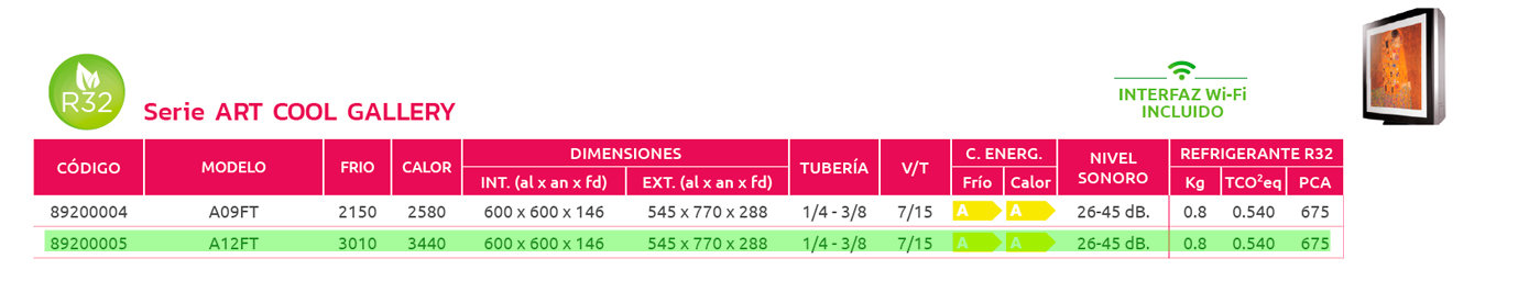 Aire Acondicionado LG, inverter, A++, R32, con Bomba de Calor. Adaptado a la normativa europea 2020 de máxima eficiencia y uso de refrigentante ecológico R32. Compuesto por una unidad exterior y otra interior. Potencia: 3.010 fg/hora en refrigeración y 3.440 Kcal/hora en calefacción. El Aire Acondicionado LG ART COOL GALLERY A12FT es un equipo de potencia alta dotado de las últimas tecnologías en climatización por aire, minimizando el consumo eléctrico y optimizando la energía consumida para un óptimo nivel de confort. Un aire acondicionado LG a un precio fantástico.