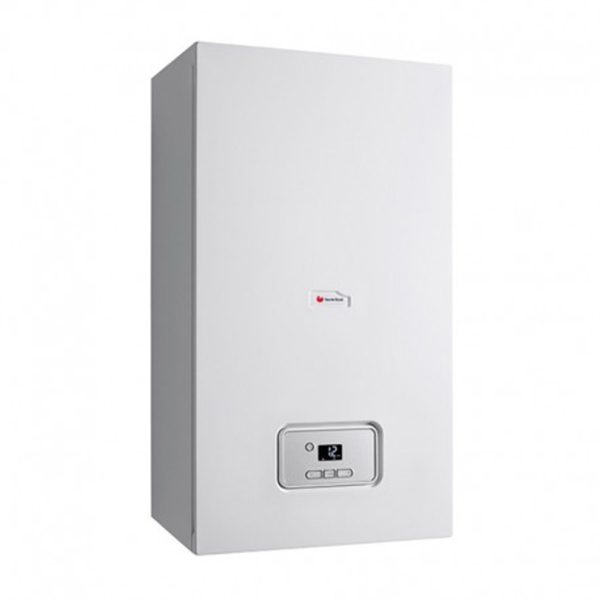 Caldera Saunier Duval de condensación, de la gama Thelia, con 25 Kw de potencia, microacumulación, sistema de modulación y ERP. Es una caldera de condensación de muy alta eficiencia energética, con sistema de modulación, que regula el funcionamiento del equipo para obtener mejores resultados con menor consumo de gas y menos cantidad de gases contaminantes expulsados.